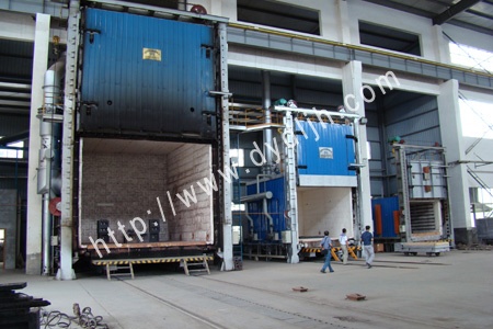 燃油台车式加热炉是以重油为燃料的悬燃炉。一般由油燃烧器、喧口和炉腔构成。油燃烧器的主要部件是燃油喷嘴和调风器。油的燃烧过程实际上是先雾化成细小油滴,喷入炉腔,油滴受热蒸发而扩散燃烧。强化燃烧过程是通过强化油的雾化、蒸发及油气与空气的混合实现的。燃油台车式加热炉燃油炉产生的烟尘很少,但是,重碳氢化合物或碳是固体,它们很难燃烧,常常没有燃完就离开炉腔,形成浓黑的烟。油燃烧温度一般为1300-1500℃,氮氧化物生成量要比燃煤炉高得多。原油中硫分大多集中于重油之中,以重油为燃料的燃油炉,也应注意防治so2污染问题。